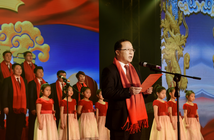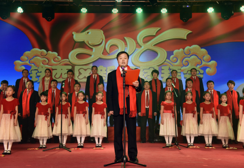 在欢乐喜庆、温馨祥和的气氛中,区级领导代表与孩子们共同献上的大合唱《我和我的祖国》,为团拜会文艺演出拉开了序幕。由区直机关、学校等单位带来的10余个精彩文艺节目不断把演出推向了高潮。全体演员们用嘹亮的歌声歌颂了铁西区2017年经济发展的丰硕成果,用翩跹的舞姿展示了对2018年全区经济社会发展的美好愿望。