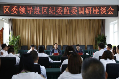 在调研座谈会上,区委常委、纪委书记、监委主任栾波汇报了近年来全区纪检监察工作情况及下一步工作思路和举措。