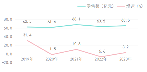 在限额以上单位商品零售额中,粮油、食品类零售额同比下降0.7%,饮料类零售额比上年增长149.9 %,烟酒类零售额比上年增长57.3 %,服装、鞋帽、针纺织品类同比下降31.5 %,化妆品类比上年增长69.8 %,金银珠宝类比上年增长36.5%,日用品类同比增长100 %,家用电器和音像器材类比上年增长15.9 %,中西药品类增长9.8%,文化办公饮品类同比下降64.0%,通讯器材类增长22.2%,石油及制品类下降28.1%,汽车类下降1.6 %,其他未列明商品同比下降8.4%。